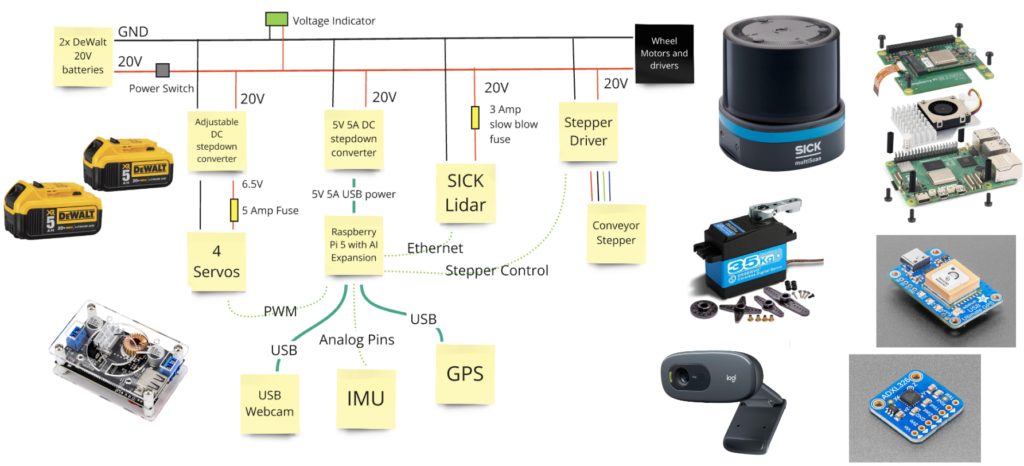 By entering and being selected for a competition hosted by SICK, an industrial LiDAR manufacturing company, we were given a 3D lidar unit to help with our project. The electrical system all came together and adaptations were made to accommodate the changing designs. The LiDAR’s built in IMU was used instead of a dedicated one, servo steering was swapped with differential drive steering for torque considerations, GPS was omitted in favor of LiDAR/IMU based positioning, and the batteries were upgraded. By using both the LiDAR and a camera with object recognition, the robot was able to detect and navigate around people and other obstacles.